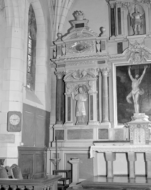 Retable architecturé à trois travées en calcaire et marbre : 2 colonnes encadrent les niches latérales à fronton cintré brisé à volutes et supportent un entablement à fronton cintré et amortissement. La travée centrale est occupée au niveau inférieur par un tableau, au niveau supérieur par une niche à double fronton triangulaire et cintré surmonté d'un amortissement. Le tabernacle est en bois.