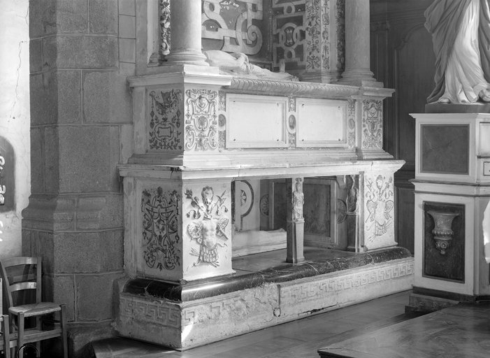 Tombeau élevé en 1553 par Jean de Lespine, architecte à Angers pour Guy d' Epinay et Louise de Goulaine. Les priants agenouillés des défunts situés dans la niche supérieure ont disparu à la Révolution. Les gisants (transis) sont répartis aujourd'hui entre les deux niches du tombeau ; celui de Louise de Goulaine dans la niche supérieure, celui de Guy d' Epinay dans la niche inférieure.