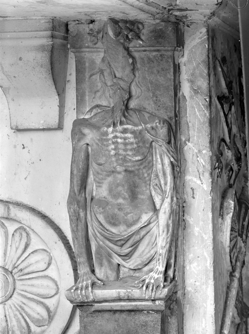 Homme à mi-corps décharné présentant au milieu du fronton l'épitaphe des défunts ; trophées et chutes de trophées sur l'entablement, les piédroits de l'arcade et le soubassement ; cariatides en gaine formant canéphores sur le soubassement.