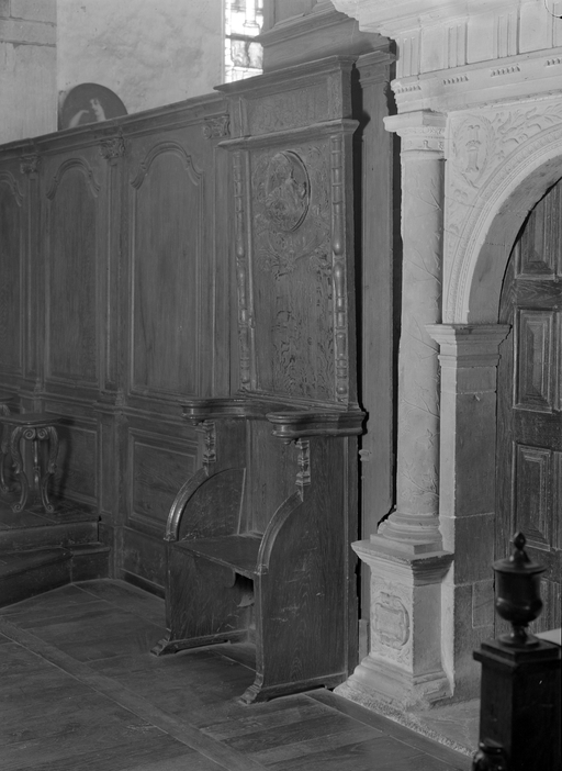 Stalle isolée d' un style proche de l'ensemble des 54 stalles et sans doute réalisée à la même époque, mais qui présente un décor et des proportions différents ; la date incomplète gravée sur le bandeau supérieur et la présence sur le dossier d' une des trois vertus théologales, la Charité, incitent à penser que cette stalle actuellement unique devait faire partie d' un ensemble de trois.