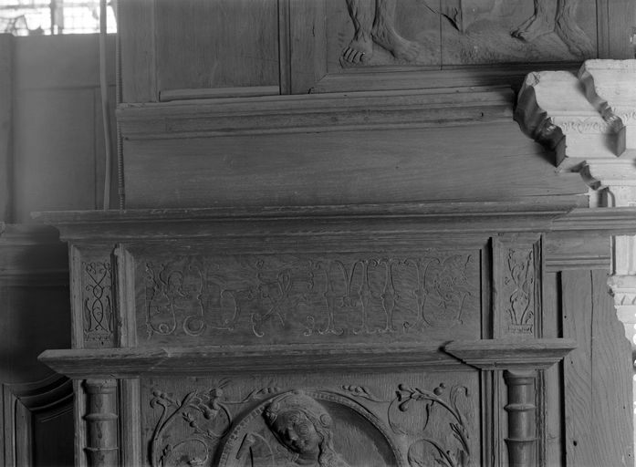 Date en creux incomplète sur le bandeau supérieur : l'an mil ; inscription concernant l'iconographie sur le phylactère à la base du médaillon : charite.