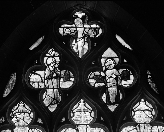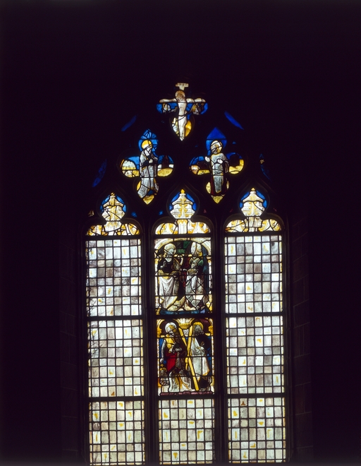 Calvaire dans le réseau ; sainte marguerite et sainte barbe dans registre supérieur de la lancette centrale ; saint jean baptiste et saint andré dans registre inférieur.