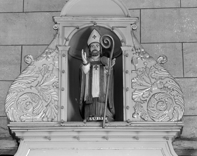 Ensemble du maître-autel : autel, retable, tabernacle, tableau, 3 statues, église paroissiale Saint-Aubin (Saint-Aubin-des-Landes),
