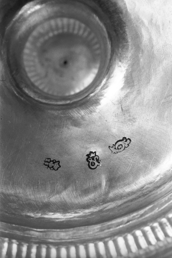 Poinçon identifié : J B Buchet, lettres I et B, hermine au milieu, fleur de lys couronnée avec deux points au dessus ; charge de Bretagne : 9 fleuronné et couronné ; lettre date 1740 1742 : lettre et couronne au dessus, hermine à l'intérieur ; armoiries non identifiées : à dextre : 6 quintefeuilles d'argent et un croissant d'or sur champ de gueules, à senestre : 3 quintefeuilles de sable sur champ d'argent.
