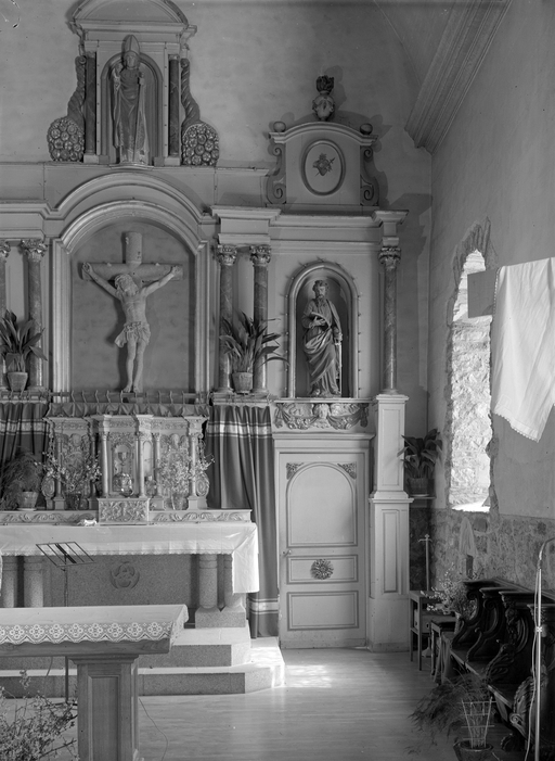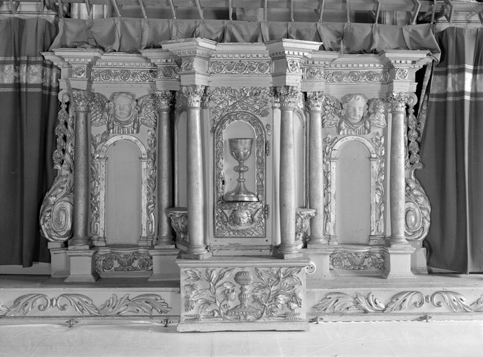 Tabernacle à ailes et fragments sculptés de têtes d' anges du 17e siècle remployés vers 1840 lors de la reconstruction de l'église dans un nouveau retable ; autel et Christ en croix du panneau central réalisés en 1956.