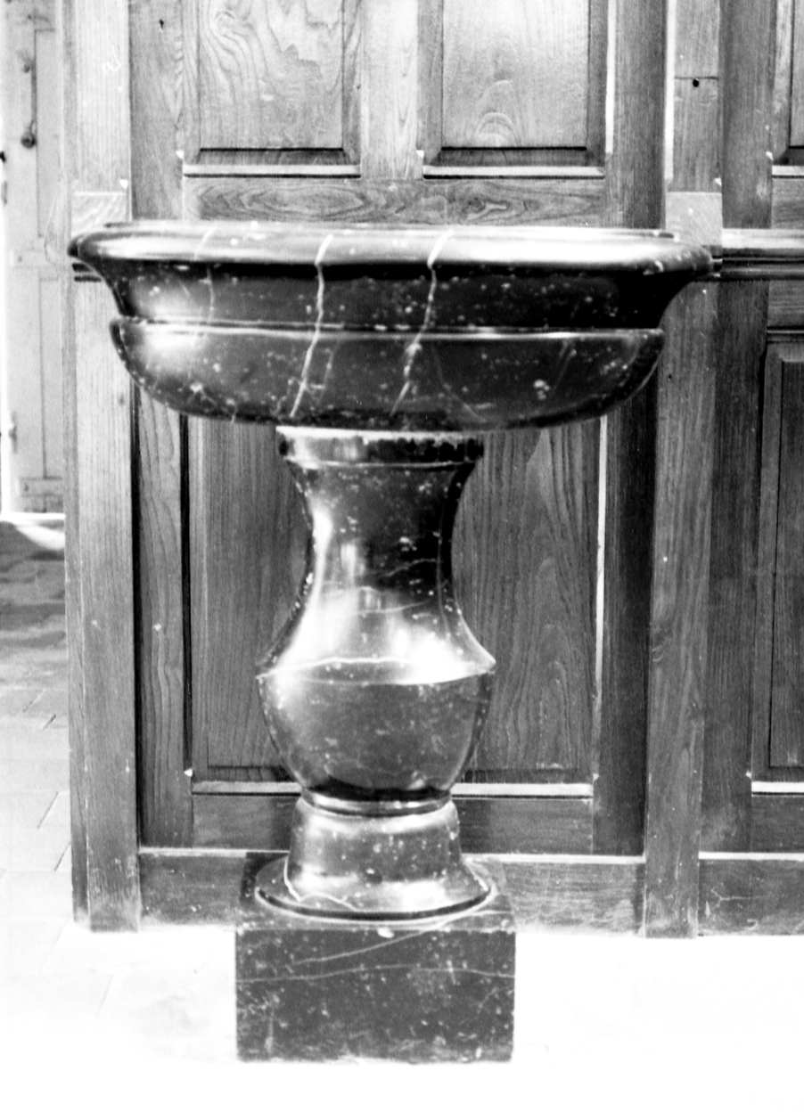 Bénitier, en marbre veiné, sur pied à base carrée et bassin ovale.