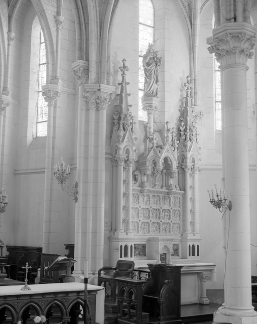 Ensemble du retable du Rosaire conçu par Regnault et sculpté par Cotard en 1899 pour la somme de 4160 francs, complété par des éléments dessinés par Savary et sculptés par Bouvier. Une statue de Vierge à l'Enfant de 1899 de la maison L. Vaugeois surmonte l'ensemble.