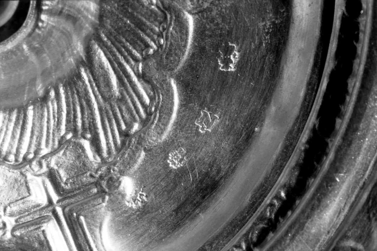Poinçons sur la patène, sous le pied et à la base de la coupe. Poinçon de maître : lettres J et F, hermine entre, M en dessous, couronne au dessus ; poinçon de charge de Vitré : lion hissant ; poinçon non identifié, lecture incertaine : insecte couronné, hermines de part et d'autre (?) ; lettre N couronnée, hermine en dessous.