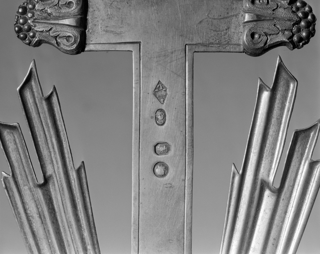Poinçon d'orfèvre et poinçon d'association (avec la lettre P à gauche) sous le pied ; poinçon de garantie et poinçon de titre sur la tranche ; les 4 poinçons au revers de la croix.