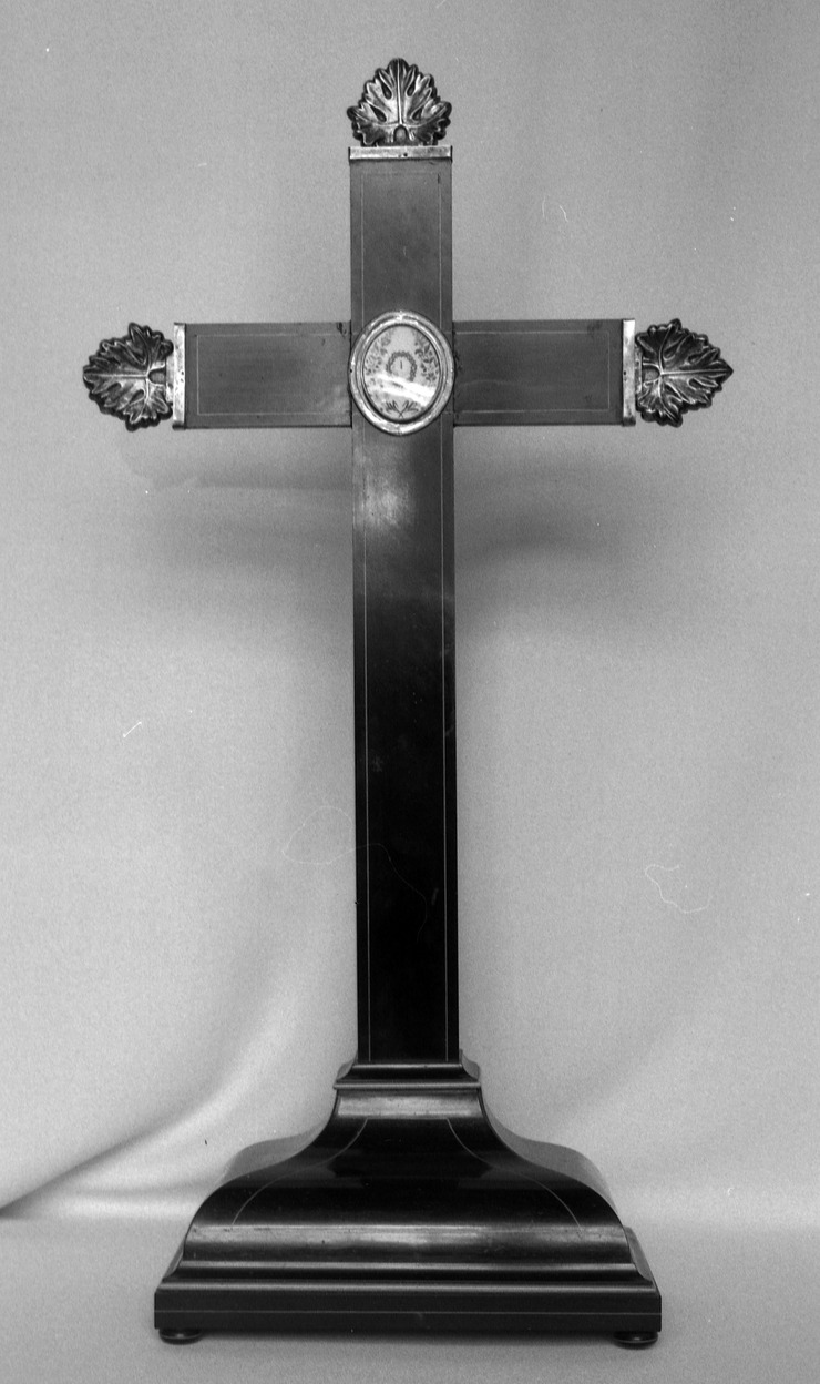 Socle en ébène plaqué, croix en ébène massif, filets de sycomore ; relique de la Croix à la croisée sur velin dans un médaillon.