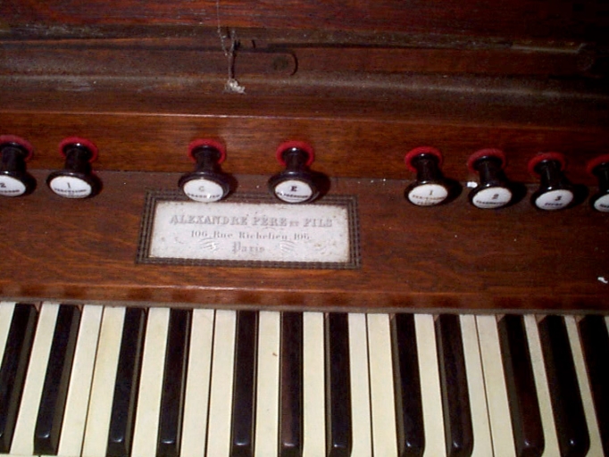 Plaque rectangulaire : ALEXANDRE PERE ET FILS 106 RUE RICHELIEU 106 PARIS ; médaille de bronze dans le couvercle : EXPOSITION UNIVERSELLE DE 1855 PARIS ; Médaille d'honneur à ALEXANDRE Père & Fils.