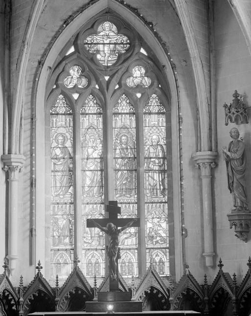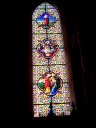 Verrière de la baie 0 (maîtresse-vitre ; verrière à personnages) : Trinité, saint Pierre, Vierge à l'Enfant, saint Joseph, saint Paul, Remise des clés à saint Pierre, Annonciation, Mort de saint Joseph, Chute de Saul sur le chemin de Damas,