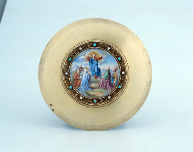 Manque une pierre sur le pied du calice ; émail de la clochette parti.