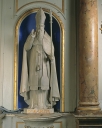 Tableau disparu, remplacé par une niche ; suppression des 2 colonnes latérales ; vermoulure au niveau des volutes des chapiteaux ; pulvérulences.