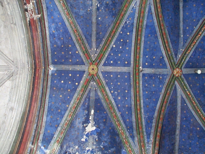Peinture murale refaite probablement vers 1860, par le peintre qui a "polychromé" la statue de la Vierge à l'Enfant située au-dessus du maître autel. Jean-Julien Hérault au moment où le curé Chevrier lui confie l'exécution de l'autel de la chapelle Saint-Samson a "retrouvé sous le badigeon des fragments de l'ancienne décoration [...] qui paraissent contemporaines de celles du grand porche méridional [...] : coeurs, attributs ou armoiries de l'évêque Etienne Coeuret (1405-1429)".