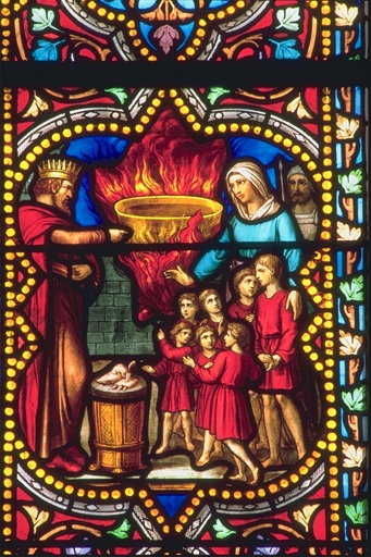 Verrière « des témoins des souffrances du Christ », par Henri Ély (par analogie avec les baies 10, 14 et 15). Tympan : l´Agneau sur le livre aux sept sceaux, entouré de vieillards de l´Apocalypse ; anges tenant des couronnes et des palmes dans les trilobes. Lancette, de haut en bas et de gauche à droite : lapidation de saint Étienne, Vierge de Pitié, martyre de saint Laurent sur le gril, stigmatisation de saint François, sainte Félicité et ses sept fils jetés dans la fournaise, saint Jean de la Croix devant le Christ du Portement de croix, transverbération de sainte Thérèse d´Avila, Job devant l´épreuve de sa maison détruite, sainte Rose de Lima agenouillée devant le crucifix. Emploi de verres rouges gravés (enfants de sainte Félicité et flammes, sceaux du quadrilobe supérieur).