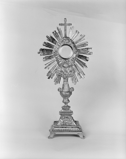 Inscription sur une étiquette sur l'étui : Bronze et orfèvrerie d'église BAZIN et COUILLARD RENNES ; poinçons sur les rayons, fabricant au revers de la croix : losange horizontal Loque (en caroline) même poinçon que sur la croix de procession.