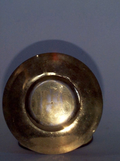 Poinçon de maître (sous le pied, sur le noeud) : lettres I - B - L, 2 grains au dessus du I et du B, fleur de lys (?) au dessus du L ; lettre-date (sous le pied) : D couronné ; poinçon de charge (sous le pied) : A ; inscription : "Oeuvre des tabernacles" ; 2 poinçons sous la patène.