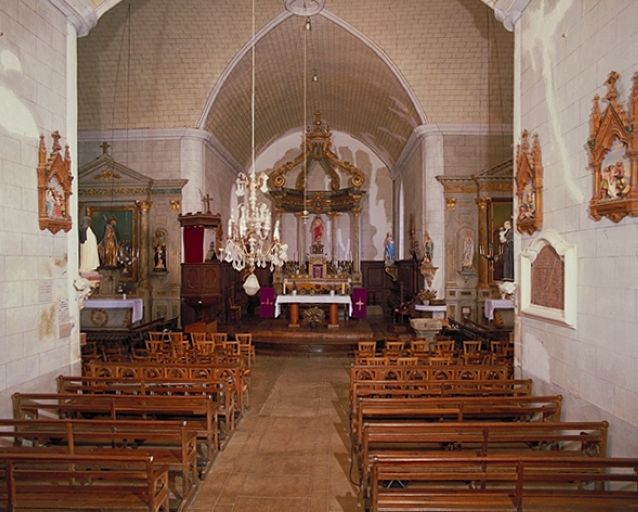 Plusieurs oeuvres datant de l'ancien Régime, les fonts baptismaux, un bénitier en marbre rose, des cloches de cérémonie, mais aussi par un certain nombre d'éléments remontés comme par exemple les jouées de quelques stalles, les balustres du garde-corps de tribune, ou encore des panneaux de mobilier conservés dans la sacristie nord, seule partie semblant subsister de l'édifice antérieur, proviennent certainement de l'ancienne église paroissiale. Sa reconstruction en 1847 entraîna la création d'un ensemble mobilier homogène pendant le 3e quart du 19e siècle ; peu remanié à ce jour, il est essentiellement composé des trois autels retables, de leurs clôtures, des lambris du choeur, de la chaire à prêcher, des confessionnaux, mais aussi des lustres suspendus dans la nef et les transepts ou encore du chemin de croix. Si les ensembles des deux autels latéraux sont attribués au menuisier Jean-Marie Commereuc, l'auteur du baldaquin du maître-autel reste anonyme. Ces oeuvres sont de facture très soignée, le travail de sculpture des tabernacles par exemple témoignant d'une indéniable recherche de qualité. L'important investissement de la paroisse à cette période peut également être ressenti grâce à l'intéressant tableau du retable secondaire sud, " L'enseignement de saint Jean-Baptiste " réalisé en 1863 par Jules Planchet, élève de l'un des maîtres de la peinture religieuse du 19e siècle, Claudius Lavergne, ou encore dans la qualité des deux statues de terre cuite encadrant le maître-autel. Ces ensembles ont été complétés par des oeuvres plus banales en plâtre ou en carton peint, tandis que l'acquisition du petit mobilier, des objets et des ornements s'est poursuivie jusqu'au début du 20e siècle. L'importance numérique des ornements, avec 48 pièces et ensembles recensés, doit être signalée, un quart d'entre eux provenant de la fabrique rennaise de E. Evellin. Les deux verrières du choeur, remplacées en 1955, ont été fournies par le maître verrier J. Klein et son élève Jumel.
