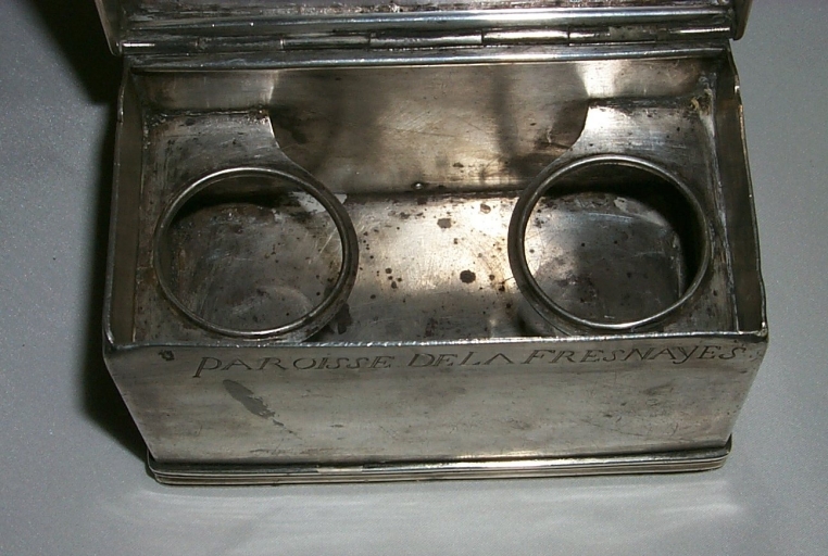 Coffret aux saintes huiles portant les poinçons de charge et de décharge (gros ouvrage) de la juridiction de Rennes pour les années 1781-1789, ainsi qu'un poinçon de ville daté de l'année 1786. Il s'agit peut-être d'une oeuvre provenant de la communauté de Dinan.