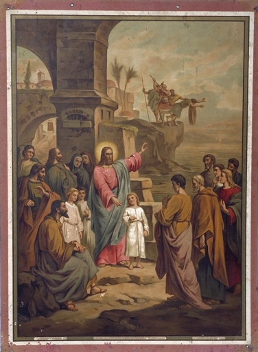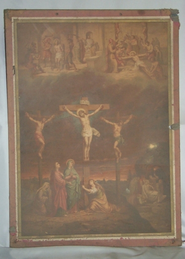 Inscription : "CATECHISME EN IMAGE N°66 [et N°5, N°19, N°24, n°39, N°45] / 8 RUE FRANCOIS 1er. PARIS. ; Inscription concernant l'iconographie : "MYSTERE DE LA REDEMPTION" ; "LE BAPTËME" ; "PRINCIPALES / OEUVRES / DE / MISERICORDE" ; "L'ORDRE" ; "5E COMMANDEMENT DE DIEU (Suite) /Homicide point ne sera, etc." ; "8E COMMt de DIEU : FAUX TEMOIGNAGE NE DIRAS NI MENTIRAS AUCUNEMENT".