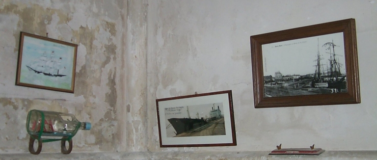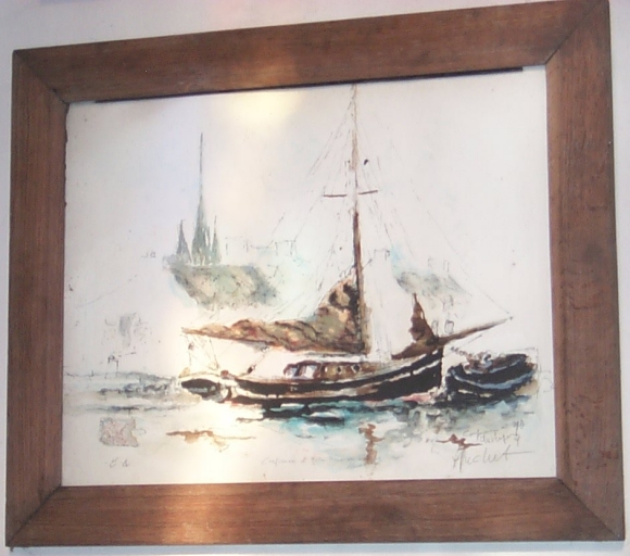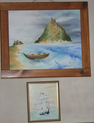 Ensemble de 13 ex-voto d'époque contemporaine : 2 demi-coque ; une maquette ; 4 dessins : un vitrail (bateaux, coquillages, signé G.H.L.), une peinture sur toile (Mont St-Michel signé J.H.), un dessin (1996, signé : St Malo 15.08.96 M.Guillard), une peinture sur bois (signée Marie Mathurin), une photographie en couleur (Officier de marine marchande Mr. Ollivier Roger, "je tiendrais nos promesses", devant un cargo), une maquette dans une bouteille ; bateau (peint sur toile, signé J. Leglou (?).