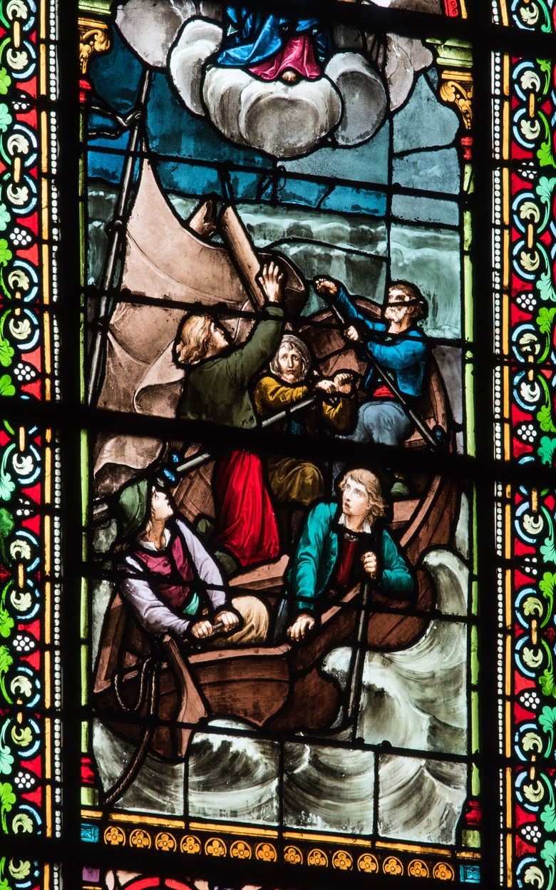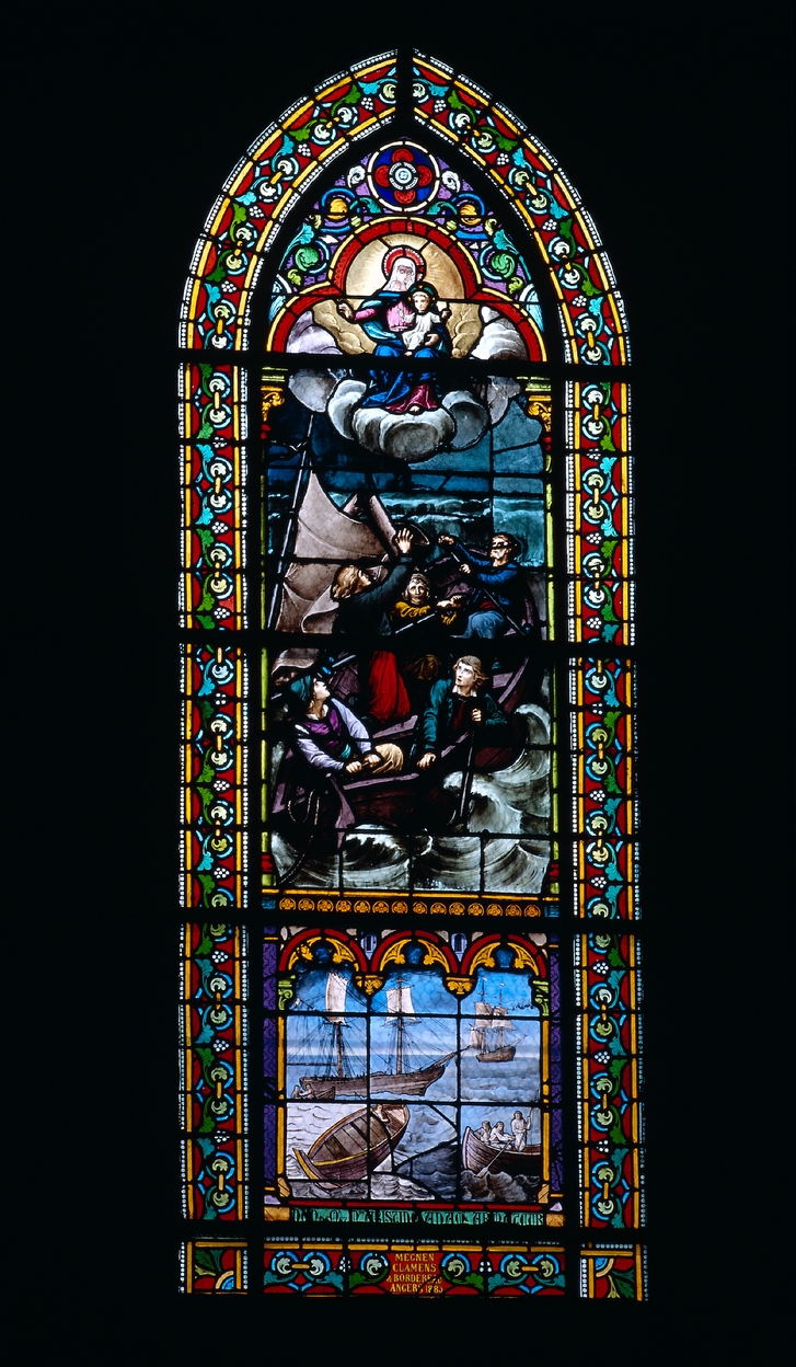 Verrière ex-voto de la baie 4 : Marins naufragés implorant la Vierge, église paroissiale Saint-Méen (Cancale),