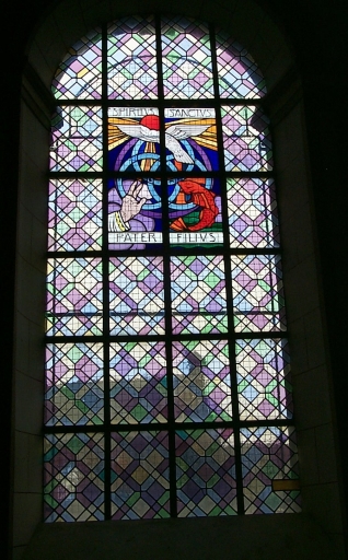 Baie 5 : donateur : OFFERT PAR LES / FLEURS D'ARVOR 1937 ; baie 6 : SPIRITUS SANCTUS / PATER FILIUS ; baie 7 : SXPS ; baie 8 : Signature : KLEIN / MAITRE-/ VERRIER /RENNES ; iconographie : JE SUIS / LE PAIN / DE LA VIE.