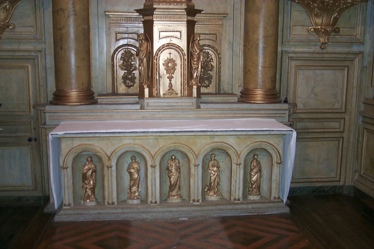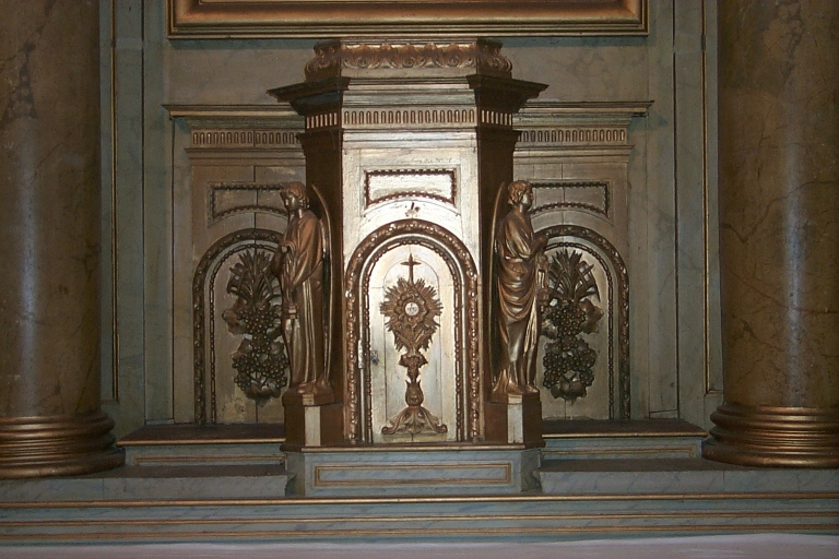 Le tabernacle et les statuettes de l'autel ont été repeintes en faux or ; il manque une aile de l'ange de droite du tabernacle et le couronnement du tabernacle.