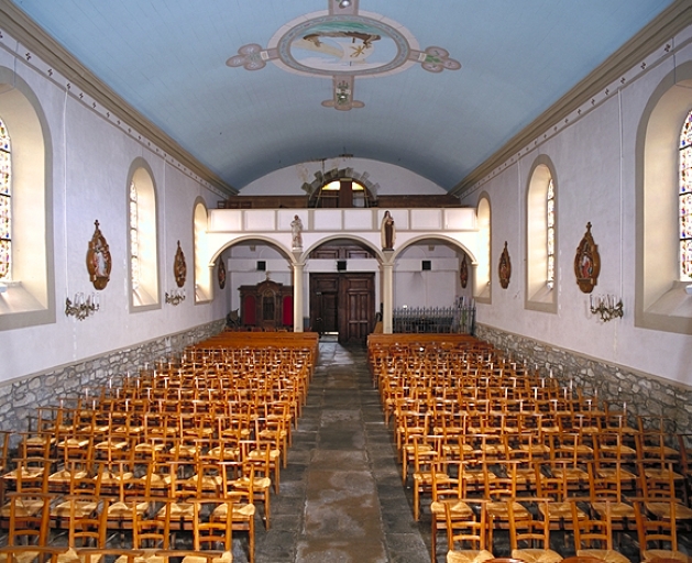 Construite dans les années 1836-1839, l'église paroissiale Saint-Colomban a reçu un aménagement intérieur et une décoration en accord avec le parti général de l'architecture, dans un style néo-classique tardif. Dans le choeur, la composition en hémicycle des grandes colonnes contribue à la mise en valeur théâtrale de la niche centrale à jour céleste occupée par une très belle statue de l'Assomption. Réalisée en 1842 par le sculpteur Henri-Hamilton Barrême, elle est encadrée par deux statues de bois placées plus en avant vers l'intérieur du sanctuaire, peut-être attribuables à cet artiste d'Ancenis. Aux bras du transept, la disposition des retables est assez comparable avec l'utilisation d'un jour zénithal éclairant un groupe sculpté placé dans une niche, au centre d'une arcature architecturée monumentale. La recherche de symétrie est aussi sensible dans l'aménagement de deux niches occupées par des statues, saint Joseph et l'Enfant et l'Education de la Vierge, au-dessus des confessionnaux nord et sud. Ces derniers, réalisés à la même époque (1842) sont attribués à l'entrepreneur Alexis Grimal et présentent un modèle local intéressant. L'aménagement du choeur se termine en 1868 avec l'installation de deux verrières représentant les apôtres Pierre et Paul, réalisées par le maître verrier nancéen E. Stelzl. Les autres verrières de l'édifice furent placées dans les années 1930 par l'atelier rennais Rault. La majorité du petit mobilier et des objets (luminaires, chandeliers et croix d'autel) ainsi que deux grands tableaux de la Vierge et de sainte Thérèse d'Avila furent acquis dans la seconde moitié du 19e siècle tandis que les statues en plâtre et les ornements liturgiques ont principalement été achetés au début du 20e siècle.