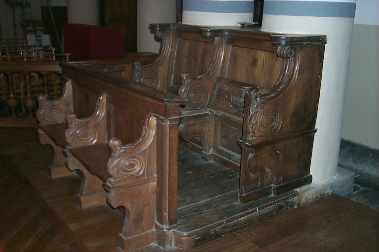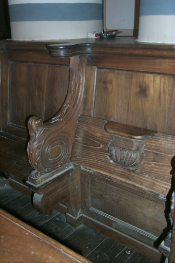 Manque un morceau de parclose ; assise des fausses stalles refaites (?) .