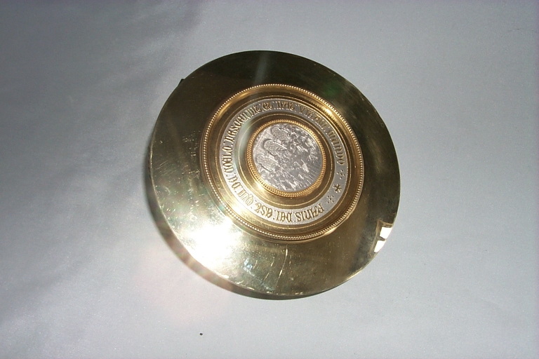 Les deux poinçons sur la coupe, le pied et la patène ; un poinçon de fabricant en plus sur la coupe ; Marque sur plaque métallique : MON ROUXEL-LEDAIN/BETIN FRES SUCRS/RENNES ; nombre : 90 ; Inscription sur la patène : PANIS : DEI : EST : QUI : DE : COELO : DESCENDIT : ET : DAT : VITAM : MUNDO ; sur le pied du calice : CALICEM SALUTARIS/ACCIPIAM ET/NOMEN DOMINI/INVOCABO ; sur la coupe : HIC EST/ENIM CALIX/SANGUINIS/MEI.