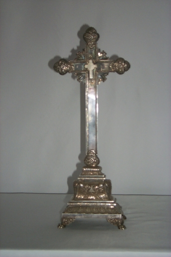 Ce reliquaire de la Vraie Croix est due à l'orfèvre parisien Jacques-Alexandre Basnier dont le poinçon de fabricant a été insculpé vers 1826 ; cette oeuvre peut donc être datée entre 1826 et 1838.