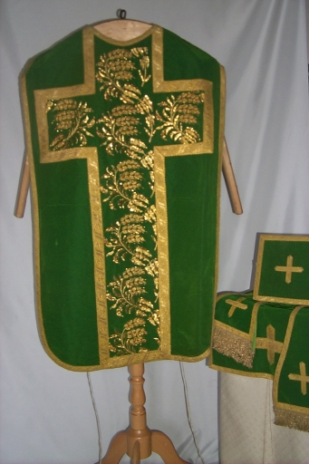 Ornement vert 2 : chasuble, étole, manipule, bourse de corporal, voile de calice,