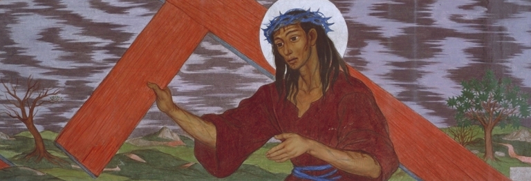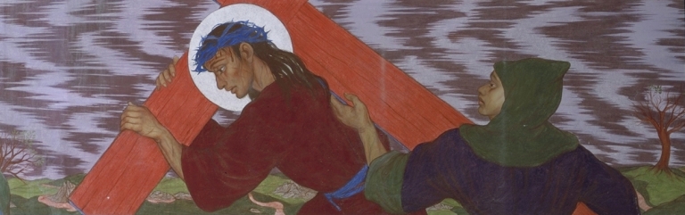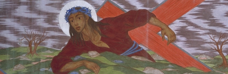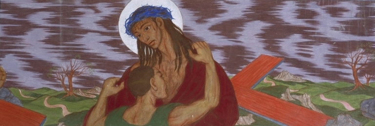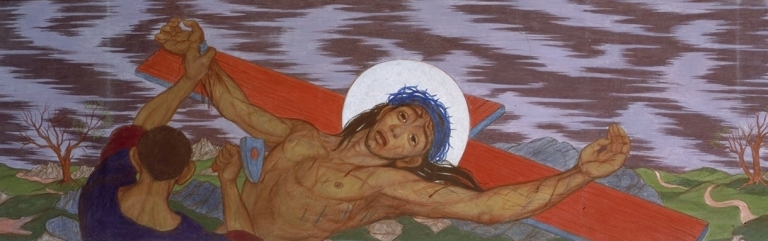 - PIOBJT L'artiste rompt ici avec la tradition iconographique en choisissant de traiter le chemin de croix comme une frise continue où les scènes se détachent sur un fond abstrait ; intérêt de la technique utilisée.