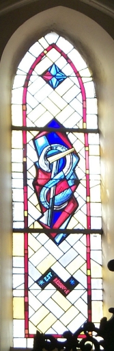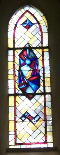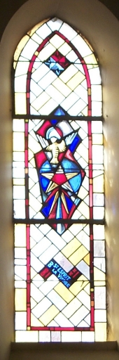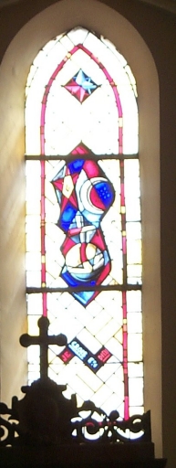 Inscription concernant l'iconographie : chaque verrière porte une phrase du Credo : baie 19 : JE CROIS EN DIEU ; baie 17 : EN JESUS CHRIST ; baie 15 : CONCU DU ST ESPRIT NE DE LA VIERGE ; baie 13 : A SOUFFERT EST MORT ; baie 11 : EST RESSUSCITE ; baie 9 : EST MONTE AUX CIEUX ; baie 10 : IL VIENDRA JUGER ; baie 12 : JE CROIS AU ST ESPRIT ; baie 14 : A LA SAINTE EGLISE ; baie 16 : A LA REMISSION DES PECHES ; baie 18 : A LA RESURRECTION DE LA CHAIR ; baie 20 : A LA VIE ETERNELLE ; signature en bas à droite de la verrière 17 : VILLETTE / MONSAINGEON / PARIS 1952 ; en bas à droite de la verrière 18 : VILLETTE / MONSAINGEON / 1952.