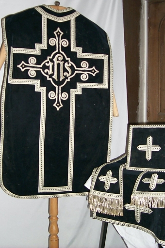 Ornement noir 2 : chasuble, étole, manipule, bourse de corporal, voile de calice,