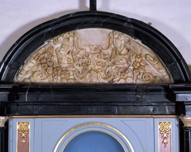 - bois, mouluré, peint, faux marbre, monochrome, doré, décor en bas relief