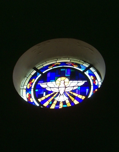Verrières à personnages des baies 4, 6 et oculus (baie 106) : saint Jean, saint Louis, colombe du saint Esprit,