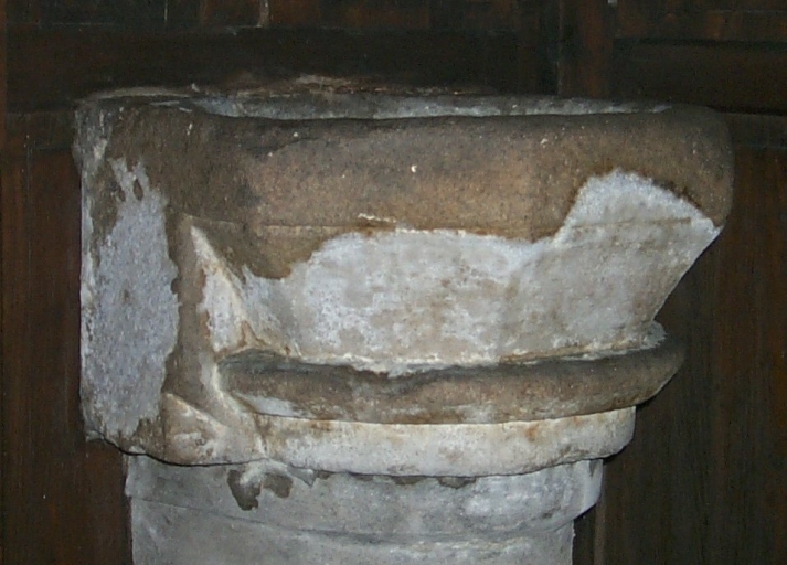 La pierre se délite sur le rebord ; le bénitier est posé sur un socle en ciment. Ce bénitier faisait partie d'une paire dont un élément a disparu.