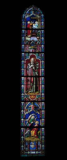 Baie 0 : BEATUS QUI LAVANT STOLAS[..] SANCT[.] AGNI ; SCS/SEXTUS ; SEXTUS CHRISTIANUS ; S. SIXT RENCONTRES. LAURENT DIACRE ; TUA VOLUNTA[S] DEUS ; armoiries de MGr Place ; baie 1 : CREDO/DEUS SOLUS/CONVERSION ; armoiries : D'argent au chevron de gueules, accompagné de 3 trèfles de sinople ; baie 2 : DON DE/Mme Vve RENARD/ET SES/ENFANTS ; baie 3 : ECR/VIRG-A DE RADICE JESSE/ Sta ANNA/ORA PRO/NOBIS ; DON DE Mme Vve E-A DE SHELDON ; A.MEURET/PEINTRE VERRIER ; armoiries (Sheldon de) ; baie 4 : SANCTUS JOACHIM/SANCTIFICAVIT TABERNACULUM [..] ALTISSIMUS ; DON DE/LA/Flle GOUIN ; A.MEURET/PEINTRE VERRIER ; baie 5 : St JOSEPH ; DON DE/Mme Vve /CAHOUR ; A.MEURET/PEINTRE VERRIER ; baie 6 : Snt LOUIS/ROI ; D N DE/Mr-Mme /L.BOCHET ; A.MEURET/PEINTRE VERRIER.