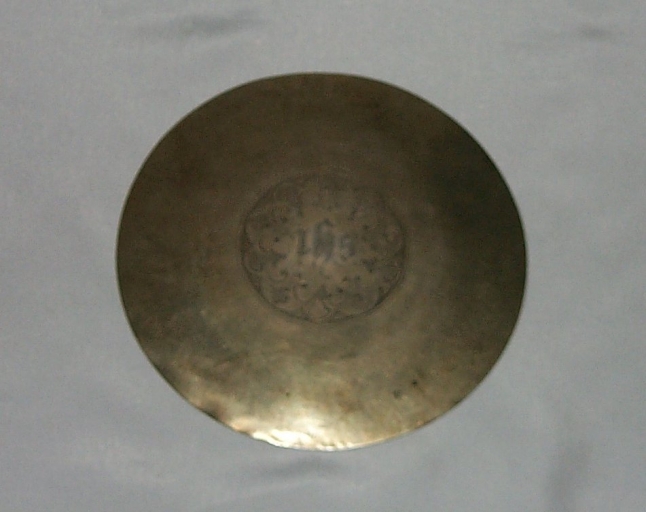 Les poinçons sont sur la coupe et le pied. Garantie et 2e titre sur la patène. Fabricant : losange horizontal, lettres J & C, une accolade. Sur le couvercle de l'étui, marque de marchand imprimée sur une étiquette : BRONZE ET ORFEVRERIE / D'EGLISE / BAZIN ET COUILLARD / RENNES.