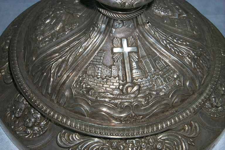 Les 2 poinçons sur le pied, la coupe et la patène ; signature : MONTIGNY, sur les médaillons.