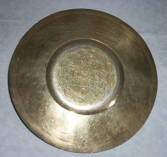 La fausse coupe est légèrement fendue, dorure partiellement effacée sur le calice et la patène.