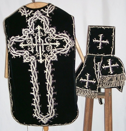 Ornement noir 3 : chasuble, bourse de corporal, étole, manipule, voile de calice,