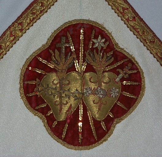 - soie, rouge velours uni, application sur textile, adjonction d'éléments