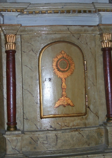 La structure du retable est probablement du 19e siècle, avec des remplois de décor plus anciens (17e ou 18e siècle) : demi-relief supérieur.