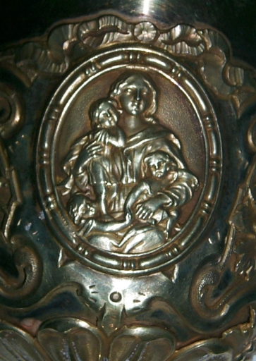 Poinçons sur le pied et sur la coupe. Fabricant : Alexandre Thierry. Sur le médaillon représentant saint Pierre, signature : MONTAGNY ; sous la représentation de la Vierge : France 1830.