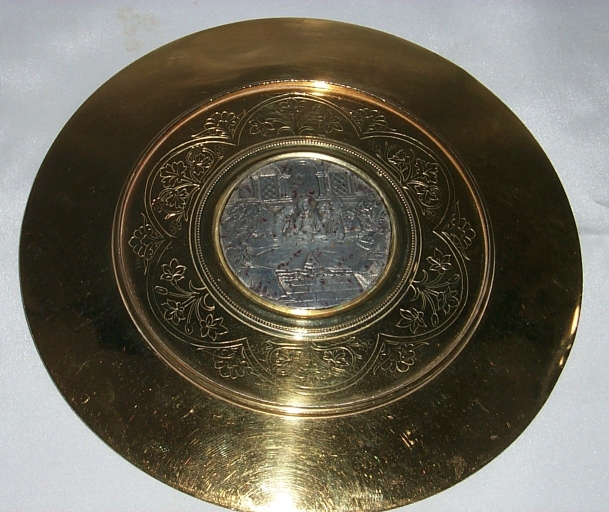 Sur chaque bouton, inscription en creux sur un phylactère : GLORIA IN EXELCIS DEO ; sur la fausse coupe, inscriptions en creux sur chaque phylactère : POTESTATES / PRINCIPATUS / ARCHANGELI / ANGELI / SERAPHIM / CHERUBIM / THRONI / DOMINATIONES / VIRTUTES. Les poinçons sont sur la coupe et la patène ; fabricant : F FAVIER. Sous le pied, une marque en creux : E. EVELLIN / une étoile / RENNES, et un poinçon carré : 2 F en miroir.