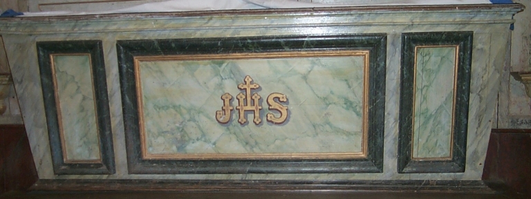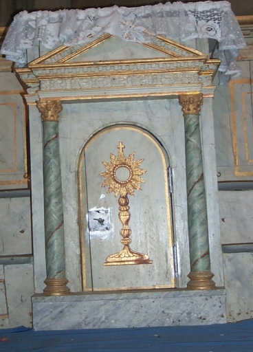 Mauvais état général : fissures, peinture écaillée ; la base de la colonne droite est rongée par les insectes et fissurée. La pierre d'autel est un remploi.